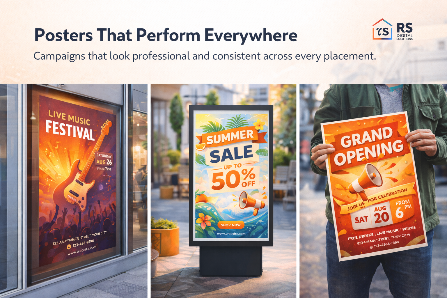 Our posters are designed to look stunning across print, storefronts, social media, websites, and outdoor advertising.
